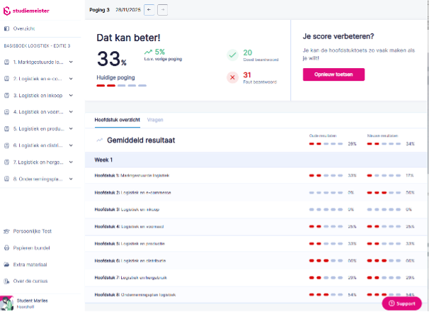 De student ziet de resultaten van de gemaakte toets en weet zo welke onderdelen goed gaan en welke onderdelen nog aandacht nodig hebben.