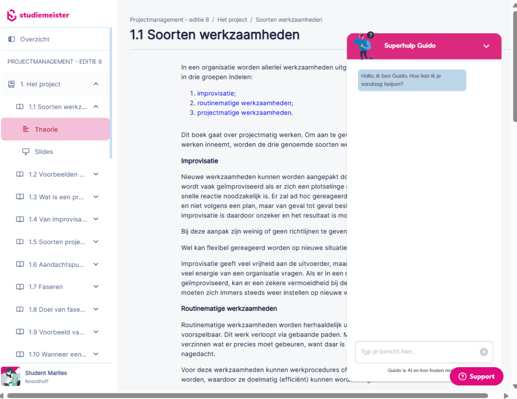 Om studenten beter te ondersteunen, hebben we in Studiemeister een online tutor toegevoegd. Deze tutor begeleidt studenten op een socratische manier door de lesstof. De tutor is beschikbaar bij de theorie en de slides in de paragrafen. Hij is getraind op de theorie en de bijbehorende hoofdstuktoetsvragen.